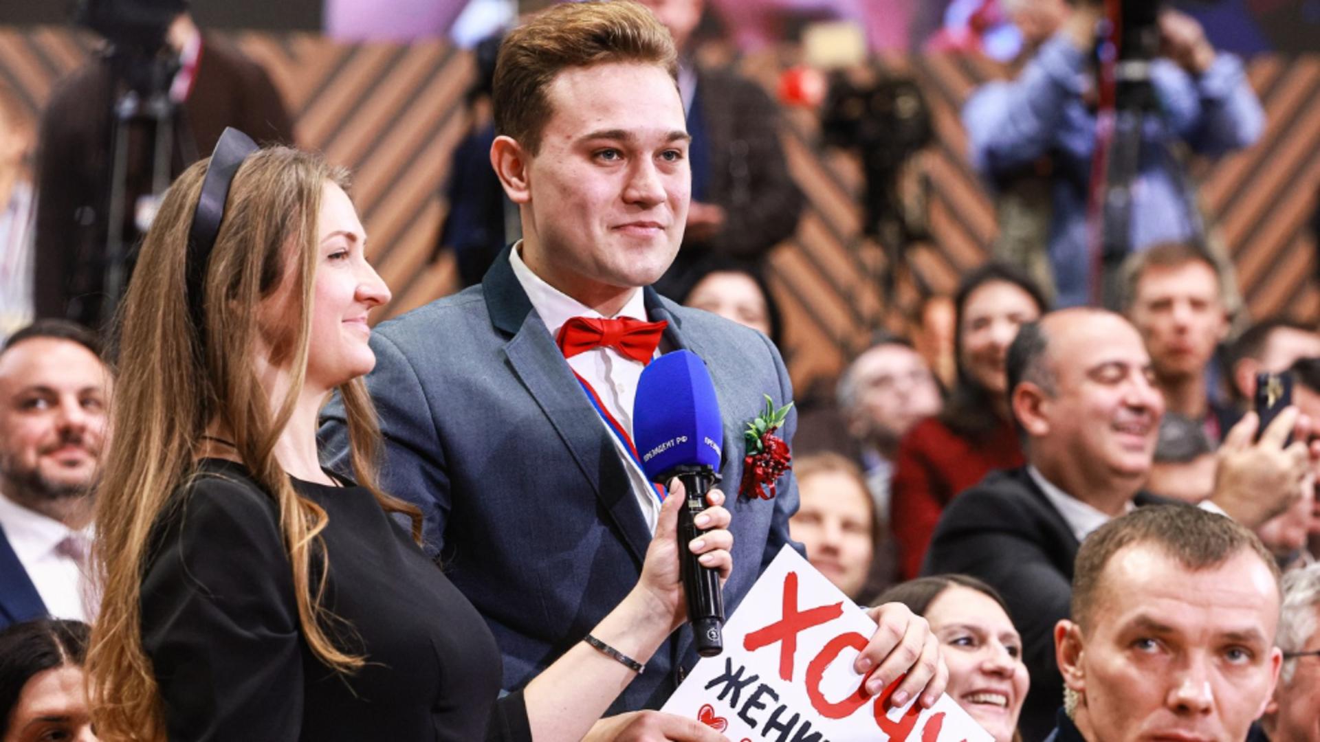 Conferința de presă maraton a președintelui Vladimir Putin, desfășurată vineri, 19 decembrie, la Moscova, a fost marcată de un moment romantic neașteptat care a detensionat atmosfera oficială. Kirill Bajanov, reporter la televiziunea regională Canal 4 din Ekaterinburg, a captat atenția tuturor afișând un mesaj neobișnuit: „Vreau să mă căsătoresc”. Ținuta sa impecabilă a fost remarcată imediat de liderul de la Kremlin, care a glumit pe seama faptului că jurnalistul pare deja pregătit pentru nuntă.